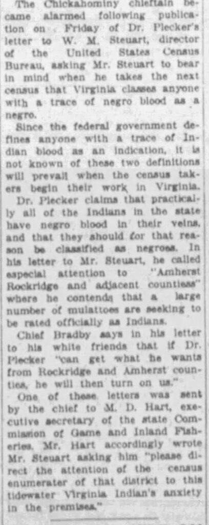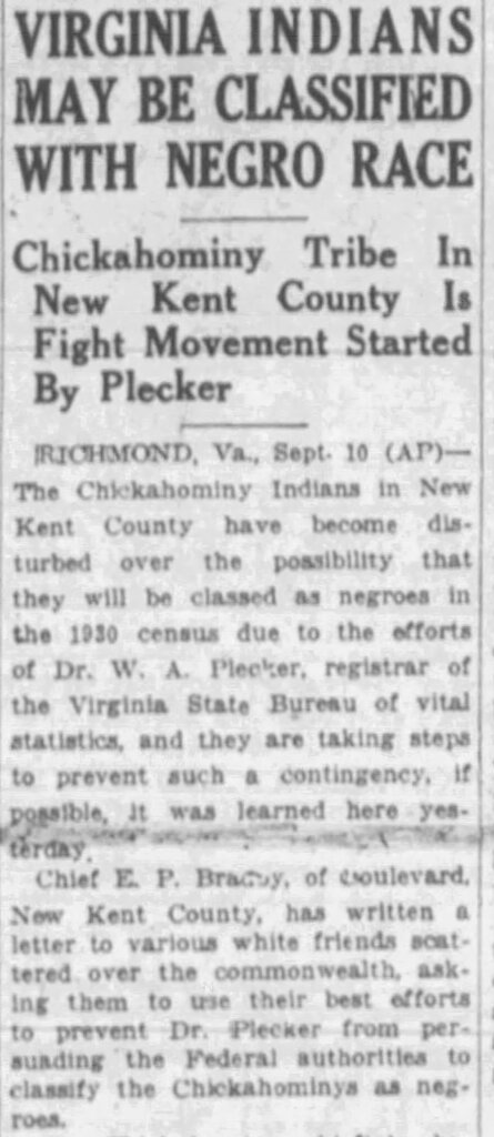 As the longtime registrar of Virginia’s Bureau of Vital Statistics, he oversaw what can only be described as one of the largest paper genocides in American history. Through policies, letters, and administrative force, he worked relentlessly to reclassify Indigenous people as “Negro,” collapsing entire tribal identities into a single racial category designed to erase land claims, lineage, and legal standing—efforts publicly reported at the time, including a 1929 newspaper account documenting his push to have the Chickahominy Tribe classified as “Negro” for the federal census.